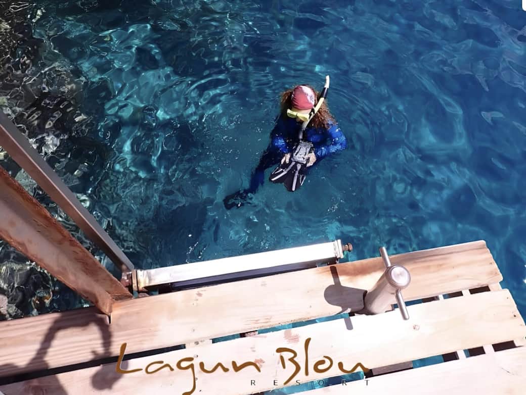Bij Lagun Blou Dive & Beach Resort duikt u vanaf de trap van het resort direct in de helderblauwe Lagun Blou. Het resort heeft zijn eigen professionele PADI-duikcentrum. Hier kun u terecht voor introductieduiken, gidsduiken en allerlei duikcursussen, van beginner tot gevorderd. Ook kunt u duikuitrusting, zuurstoftanks en lood huren. Voor de niet-duikers is er ook snorkelmateriaal beschikbaar. Klik hier voor een prijslijst.
